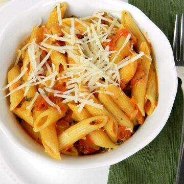 Penne with Vodka Sauce, aka Penne alla Vodka, is tender pasta tossed in a creamy tomato sauce with crushed tomatoes, onion, garlic, vodka, fresh basil, and grated Parmesan cheese. This big bowl of comfort food is perfect for a weeknight dinner or for company!