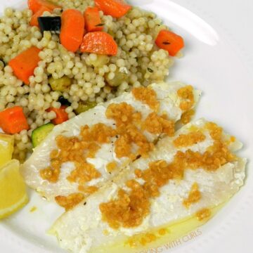 I found this recipe is in an old Sunset Italian Cookbook that is literally falling apart, and I needed to make a few changes. I added olive oil and cut down on the butter. It did not effect the flavor one bit, this Dover Sole recipe with Caramelized Garlic is delicious! Somewhere Paula Deen is crying over that statement, but adding olive oil actually helps to keep the butter from burning.
