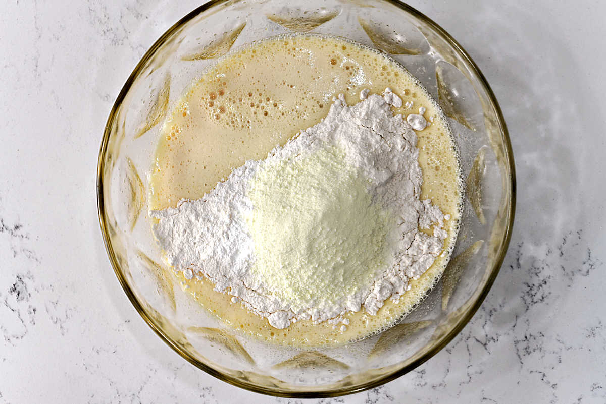 - In a separate bowl, mix together the flour, pudding mix, dry milk, baking powder, and salt. Gradually add the dry ingredients to the wet mixture, then continue mixing on medium speed until smooth and ingredients are incorporated.