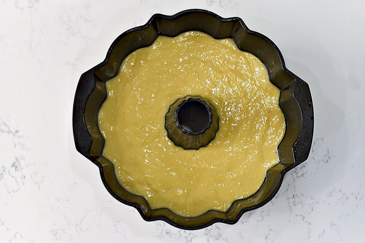- Pour the batter into the prepared bundt pan. Tap on the counter (or floor) to release the air bubbles.