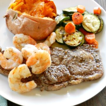 This flavor-packed meal is better than any restaurant serves and it costs much less, especially if you find steaks and shrimp on sale!!