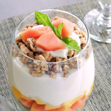 Start your morning off with this luscious Papaya Mango Yogurt Parfait with Greek yogurt, slightly sweet and crunchy granola, honey, and of course chunks of tropical papaya and mango!