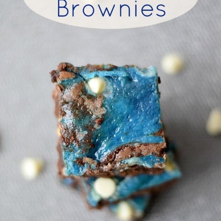 These swirled cream cheese Galactic Brownies from scratch are the perfect dessert for both brownie and cheesecake lovers. Rich, fudgy brownies with thick swirls of blue colored cream cheese filling topped with white chocolate chips “stars” make these brownies out of this world decadent!