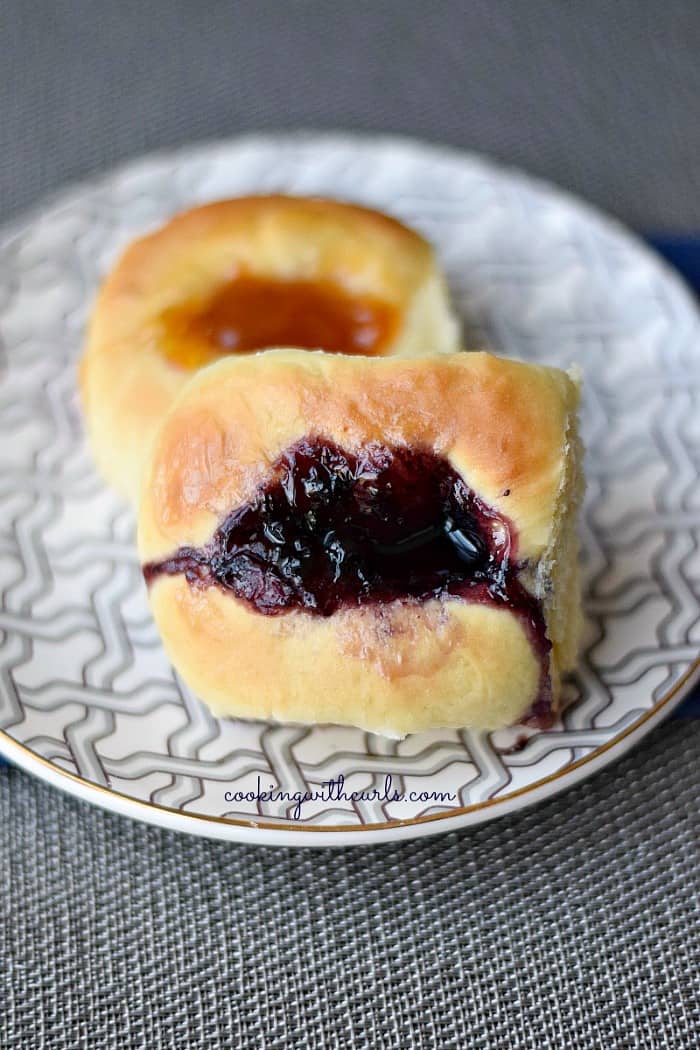 Dip your finger or thumb in cooled, melted butter and make a deep indentation in the center of each dough ball to form “wells”, and fill it with your choice of fruit preserves or cream cheese filling.