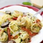 Easy Shrimp Pesto Pasta is simple recipe that is perfect for busy weeknights. Juicy shrimp tossed with sautéed carrots, zucchini, mushrooms, and bell pepper strips, then mixed with an easy homemade pesto sauce and al dente cooked pasta.
