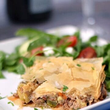 Greek Phyllo Meat Pie, known as “Kreatopita” in Greek, is a delicious dish made with layers of thin phyllo pastry filled with a mixture of seasoned ground lamb or beef, with eggplant, zucchini, tomatoes along with herbs and spices.