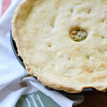 This pot pie can be baked in a 9-inch pie dish, cooking times will vary. A 12-inch skillet will also work as seen in the original image above, but it will be thinner and you will need to adjust the cooking time.