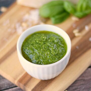 Traditional Basil Pesto made with basil, pine nuts, Parmesan cheese, and extra virgin olive oil is blended into a thick paste that is perfect mixed with pasta, like this Shrimp Pesto, as a spread on on sandwiches like Roast Beef Pesto Panini. It is so versatile and can be used a million different ways, and it’s super simple to make!
