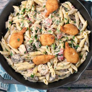 This Double Shrimp Pasta is a restaurant quality meal that is incredibly easy to make at home in about 30 minutes! Penne, sautéed shrimp, tomatoes, mushrooms, Parmesan, Romano, Asiago-herb sauce, and breaded shrimp…Perfection!!