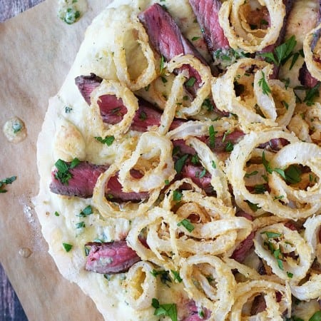 Change up your pizza night routine with this amazing Steakhouse Pizza topped with a creamy white pizza sauce, thinly sliced steak, gorgonzola butter and crispy onion rings! This delicious steak pizza is guaranteed to impress!!