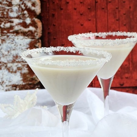 These festive martinis are made with vanilla vodka, peppermint schnapps, Godiva white chocolate liqueur, heavy cream, and sugar crystal rimmed glasses for extra sparkle.