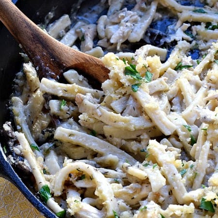 This old-fashioned Chicken Tetrazzini recipe is filled with a rich and creamy mushroom sauce, chopped chicken and spaghetti noodles, then then topped with a crunchy parmesan crust. It’s an easy to make casserole that the whole family will love.