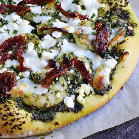 This amazing Shrimp Pesto Pizza is topped with kale pesto, sun-dried tomatoes, feta and mozzarella cheese on a light and chewy homemade crust.