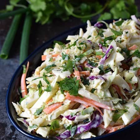 This sweet, tangy, and crunchy Apple Coleslaw is the perfect addition to barbecue chicken or pork sandwiches and even pizza! It has a slight Asian fusion vibe to it that gives it it’s sweet and tangy flavor, but subtle enough to not be overpowering.