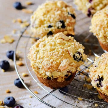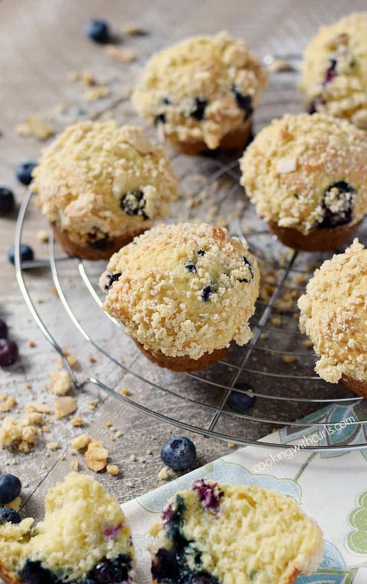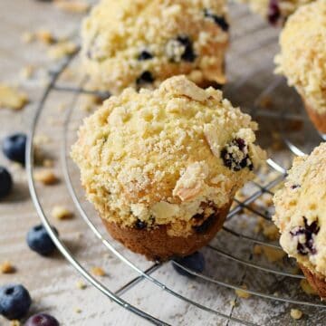 Moist, tender Bakery Style Blueberry Muffins bursting with ripe blueberries and topped with a crumbly almond streusel topping. The perfect sweet treat for breakfast, brunch, or afternoon snack!