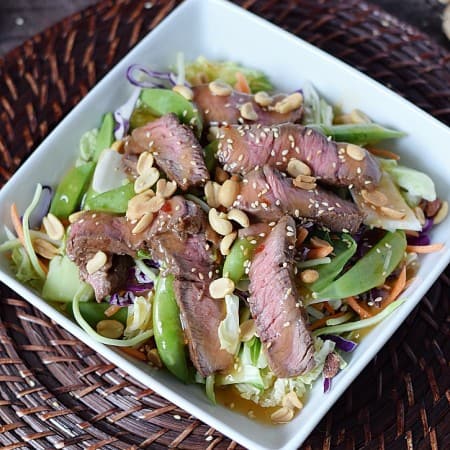 - Place steak slices over salad and top with dressing, peanuts, and toasted sesame seeds. Serve immediately.