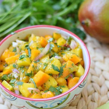 Cubes of juicy mango and papaya are combined with red onion, cilantro, lime juice, and chipotle pepper to create this refreshing and versatile Papaya Mango Salsa recipe. It is perfect as a dip with chips and equally delicious as a topping for fish and chicken!