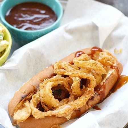- Make the onion rings ahead of time so you can throw these Barbecue Bacon Hot Dogs together right when they come off the grill.