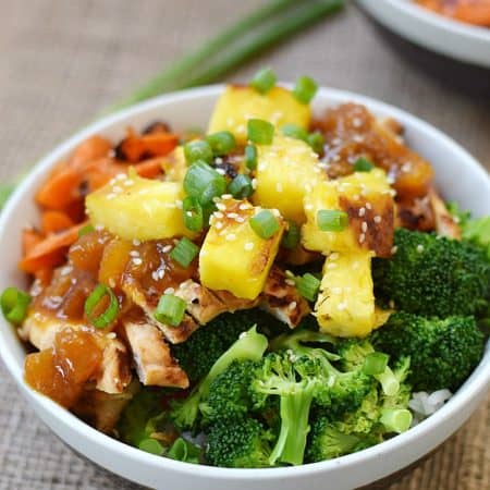I don’t think that I have ever met anyone that does not like pineapple. It’s tart, sweet, and good for you…what’s not to like? Grilled pineapple is even better, and makes the perfect addition to these delicious chicken rice bowl recipe.