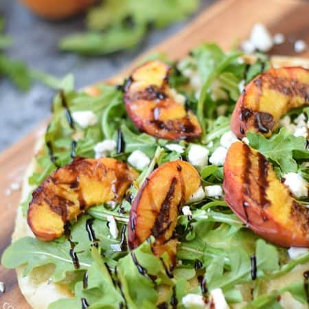 Fire up the grill and celebrate the freshest summer produce with this Grilled Peach and Arugula Pizza! It is topped with goat cheese and drizzled with balsamic glaze for the perfect summer pizza!