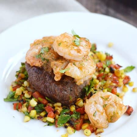 Spoon Grilled Corn Relish into the middle of a dinner plate and top with steak. Spoon half of the shrimp over the steak. Repeat with second plate…and grab a steak knife!