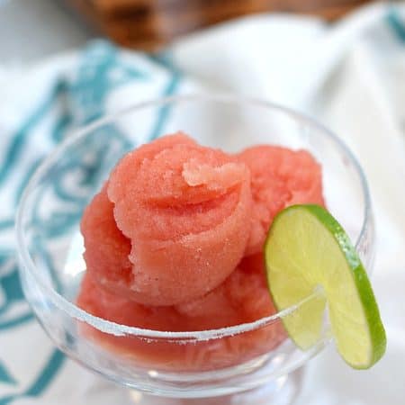 This icy cold Watermelon Margarita Sorbet is fresh and delicious, which makes it the perfect dessert to serve on a hot summer night!