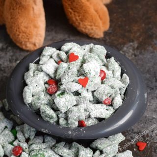 Question…..do you call it Grinch Puppy Chow or Muddy Buddies? We called it Puppy Chow in California, and of course the Grinch has a dog named Max, so I went with Grinch Puppy Chow.