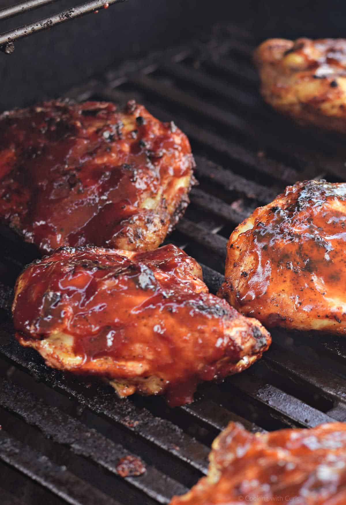 The bbq chicken thighs on the left have been basted with Cherry Bourbon Barbecue Sauce and the ones on the right are Bourbon and Brown Sugar Barbecue Sauce.