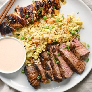 Delicious, Hibachi Steak and Salmon are grilled to perfection on a cast iron skillet, then served on a bed of hibachi fried rice just like the kind on the menu at your favorite Japanese steakhouse! Complete your meal with hibachi rice, ginger-carrot salad dressing, and everyone’s favorite Yum Yum sauce!