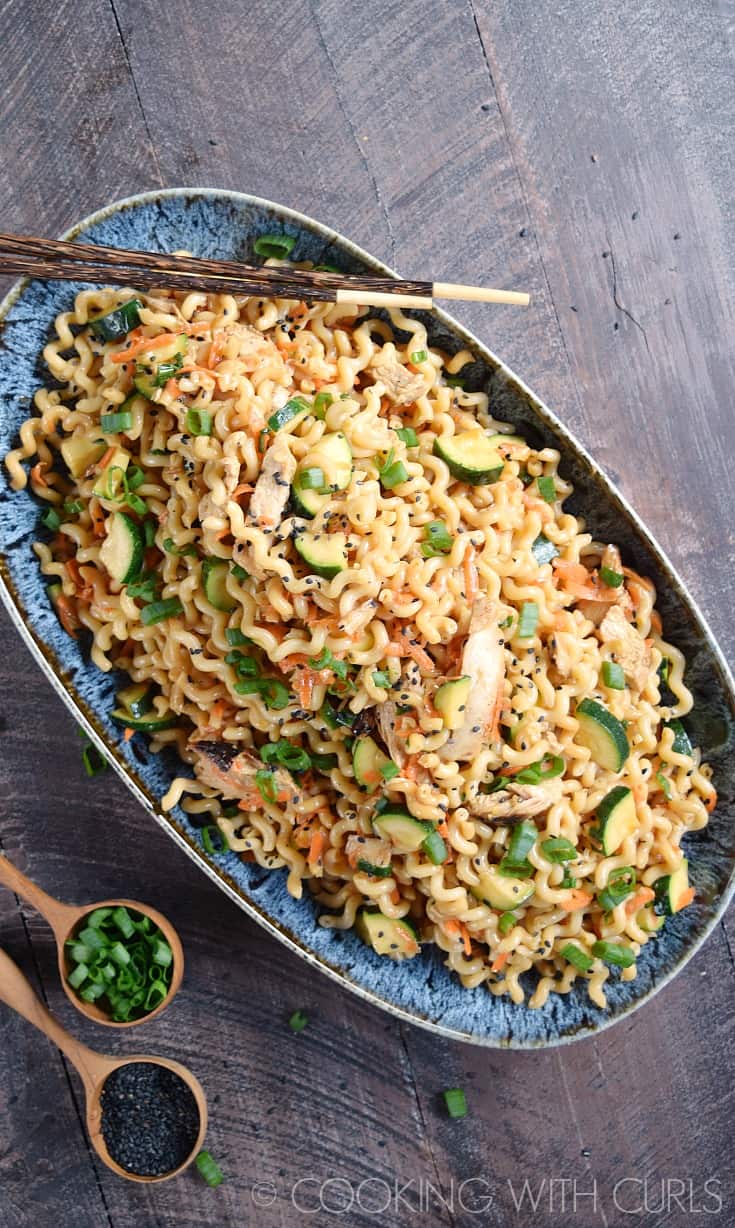- Place the cooked noodles in a large bowl with the grated carrots, quartered zucchini, chicken, green onions, and sesame seeds.