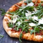 This pizzeria style Prosciutto-Arugula Pizza is made at home with simple ingredients, a very hot grill or oven, and a baking stone! Yes you can achieve a chewy, crispy crust at home and I will show you exactly how to do it. Most grocery stores or Italian delis sell prosciutto and Parmigiano-Reggiano cheese. Then choose a sauce, make your dough and you are ready to roll.