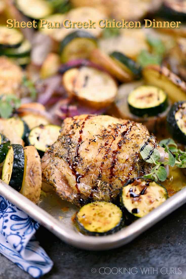 This Sheet Pan Greek Chicken Dinner with roasted potatoes and vegetables is a quick and easy meal that is perfect any night of the week! You can change up the vegetables, use different types of potatoes, it’s a versatile meal that your whole family will love.