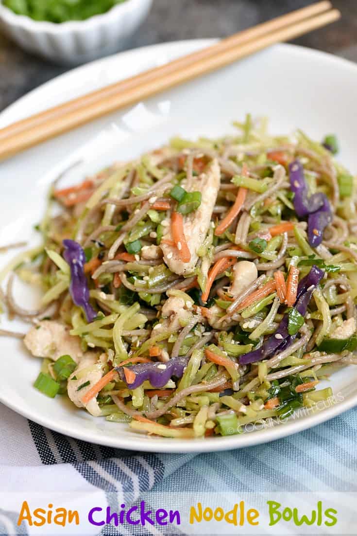 I love Asian food. I love noodles {especially soba noodles}, and I love anything that is super easy to throw together when life gets crazy and unpredictable. These Asian Chicken Noodle Bowls check all of the boxes!
