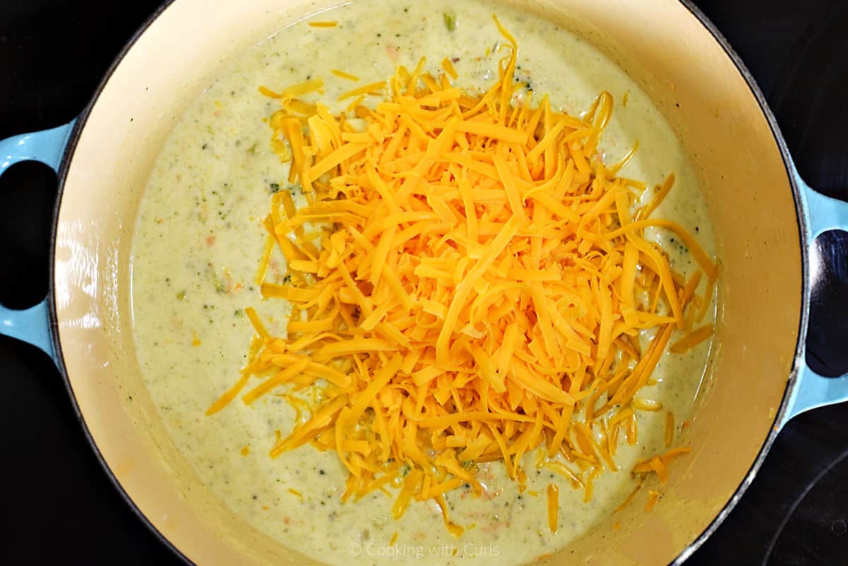 - Stir in shredded cheese a handful at a time over low heat. This ensures it melts evenly into the soup without forming clumps.