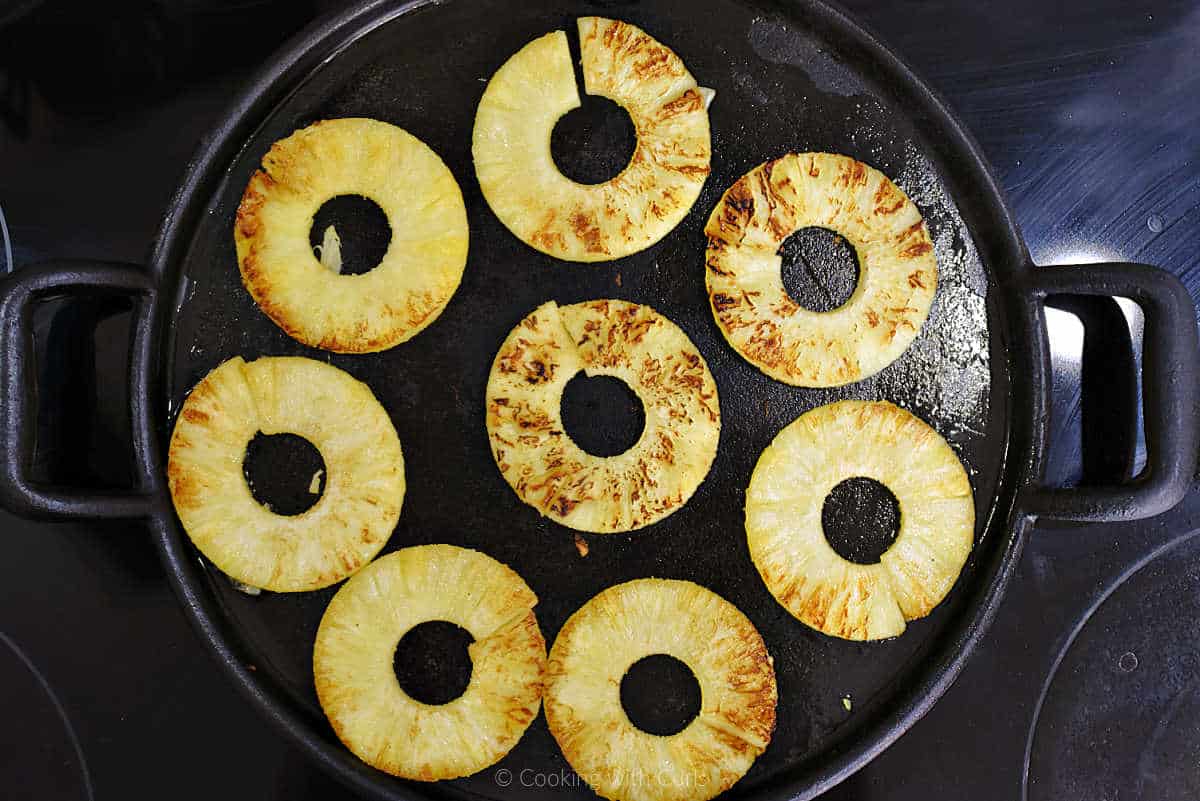 - Lay quarters flat and slice into bite-sized chunks. Char pineapple chunks on griddle pan or skillet. Add a bit of oil if the pineapple sticks to the pan.