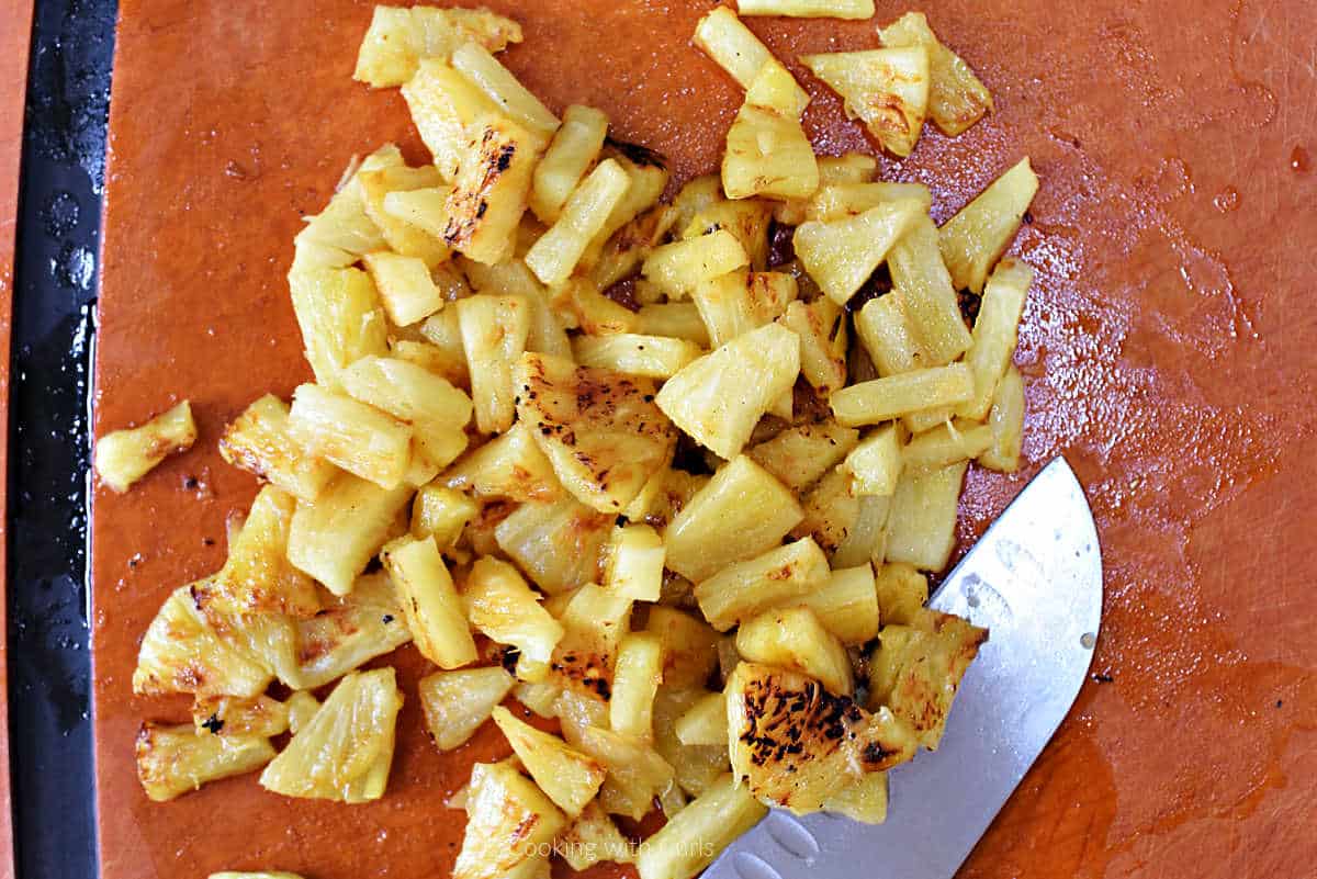 - Char your pineapple slices on the grill or a skillet before dicing them to add a smoky sweetness! Place charred pineapple on a cutting board and cut into chunks.