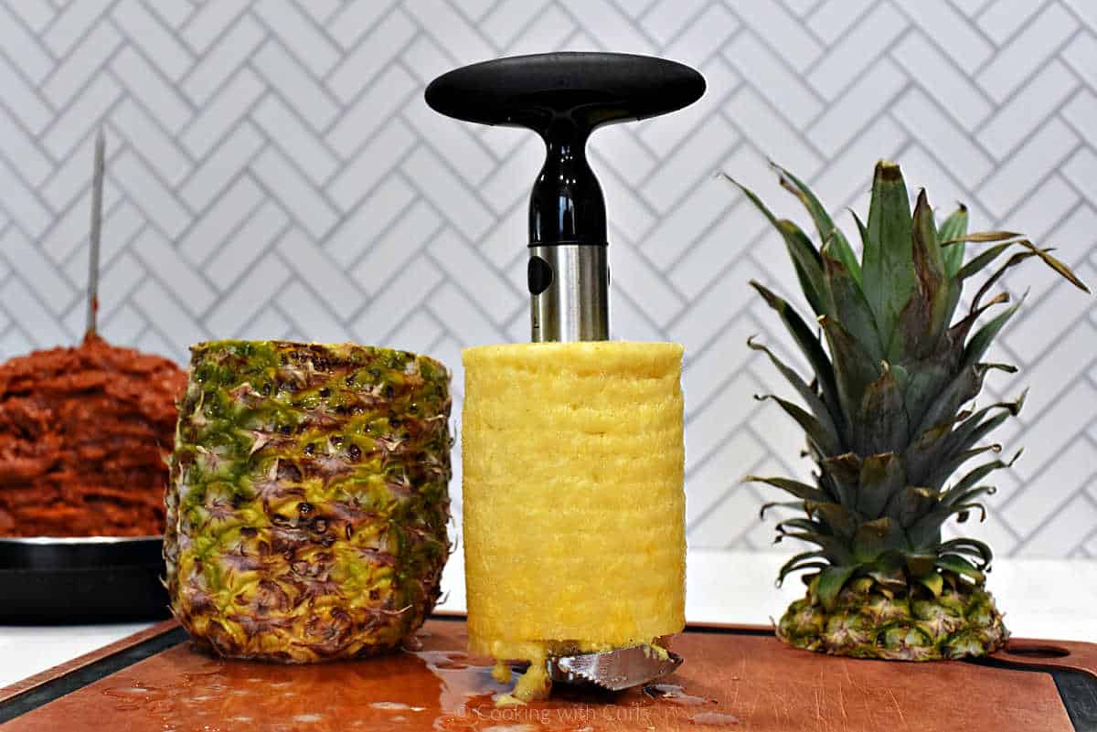 - If using a pineapple corer & slicer: Stand the pineapple up on a cutting board. Slide the slicer down the center of the pineapple, try to line it up with the core. Twist the corer down the pineapple – do not piece through the bottom.