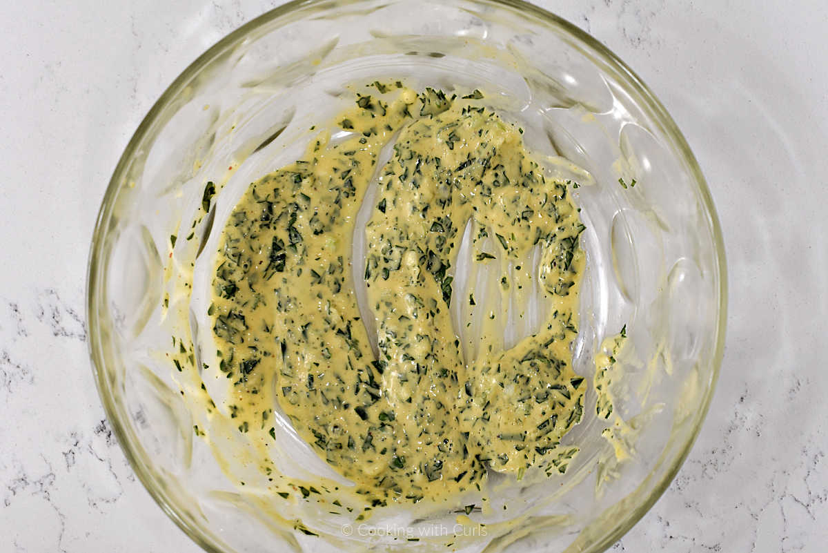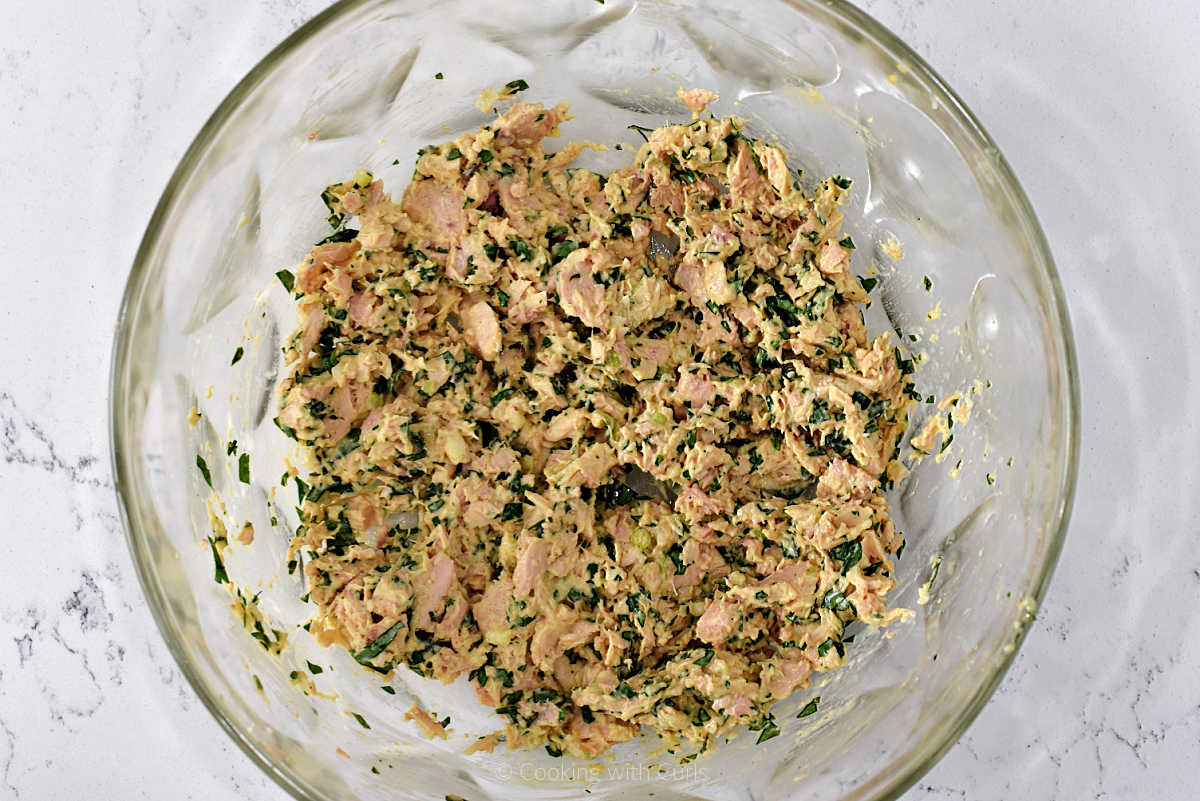- Whisk together the egg, mayonnaise, Dijon (or your favorite condiment) in a mixing bowl. Stir in onion, garlic, and fresh parsley – or herbs of your choice.