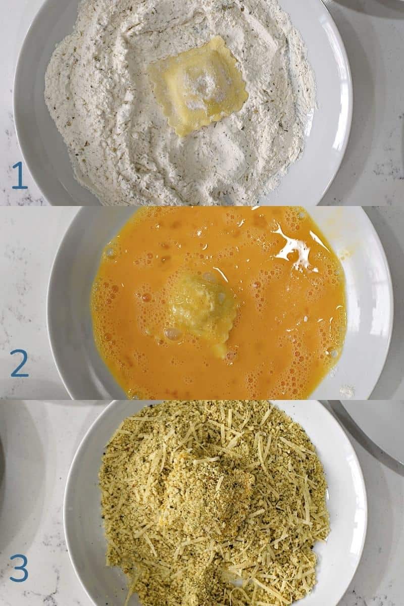 - Take the time to dip each ravioli fully in flour, then egg, then bread crumbs. Press gently when coating to help the crumbs adhere. If your coating looks sparse, give it another quick dip in the crumbs. Bare spots risk chewy results or even burnt, exposed pasta.