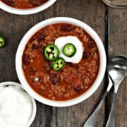 Ladle chili into bowls and serve garnished with your favorite toppings.